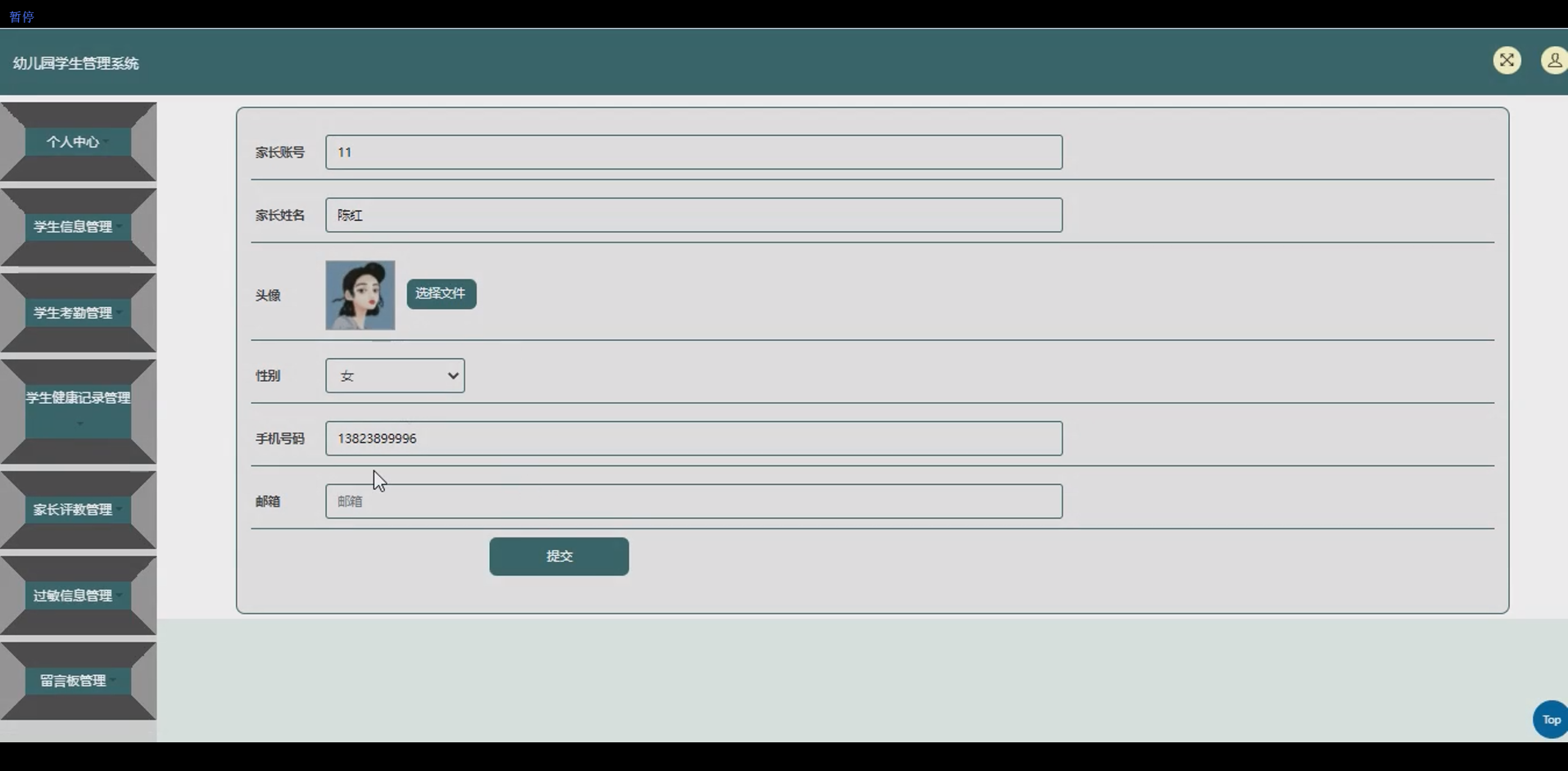 教师登录系统后,可进行课程信息管理(添加、修改、删除课程内容、上课时间、教学目标等)、教学计划制定与管理(制定学期教学计划、周教学计划,并可根据实际情况进行调整)、学生考勤管理(记录学生的出勤、缺勤、迟到、早退等情况,并标注缺勤原因)、学生健康记录管理(记录学生在园期间的身体状况,如体温、有无不适症状、就医情况等)、家长评教查看与回复(查看家长的评教内容,对家长提出的问题和建议进行回复)。同时,教师还可查看学生的过敏信息,在日常教学和生活中做好相应的防护措施。