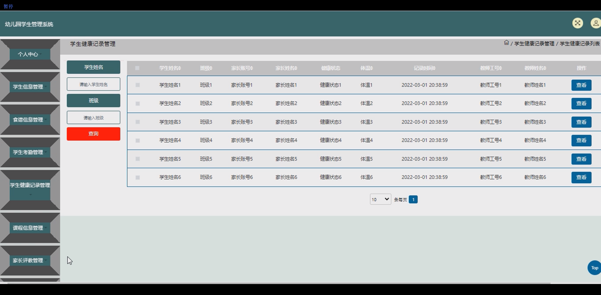 教师实时记录学生在园期间的健康状况,包括每日体温测量结果、有无咳嗽、呕吐、外伤等不适症状,以及学生在园期间的就医情况、服药情况等。系统会对学生的健康数据进行存储和整理,形成学生个人健康档案,管理员和教师可根据健康档案了解学生的健康状况,对于健康状况不佳的学生,及时与家长沟通并采取相应措施。此外,家长也可通过系统查看孩子的健康记录,了解孩子在园的身体情况。