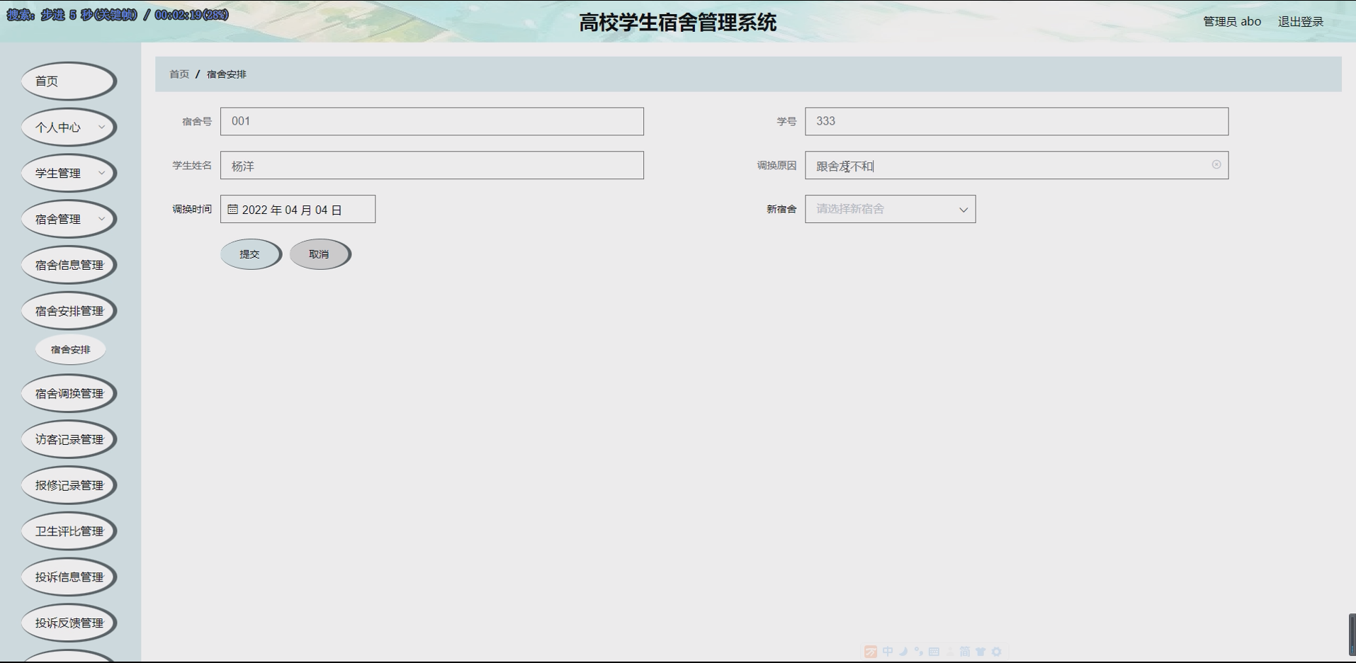 - 功能描述:支持学生发起宿舍调换申请,管理员进行审核和处理。学生需填写调换原因、目标宿舍要求等信息,管理员根据宿舍空余情况和申请理由进行审批,审批通过后更新宿舍安排信息,并通知相关学生。