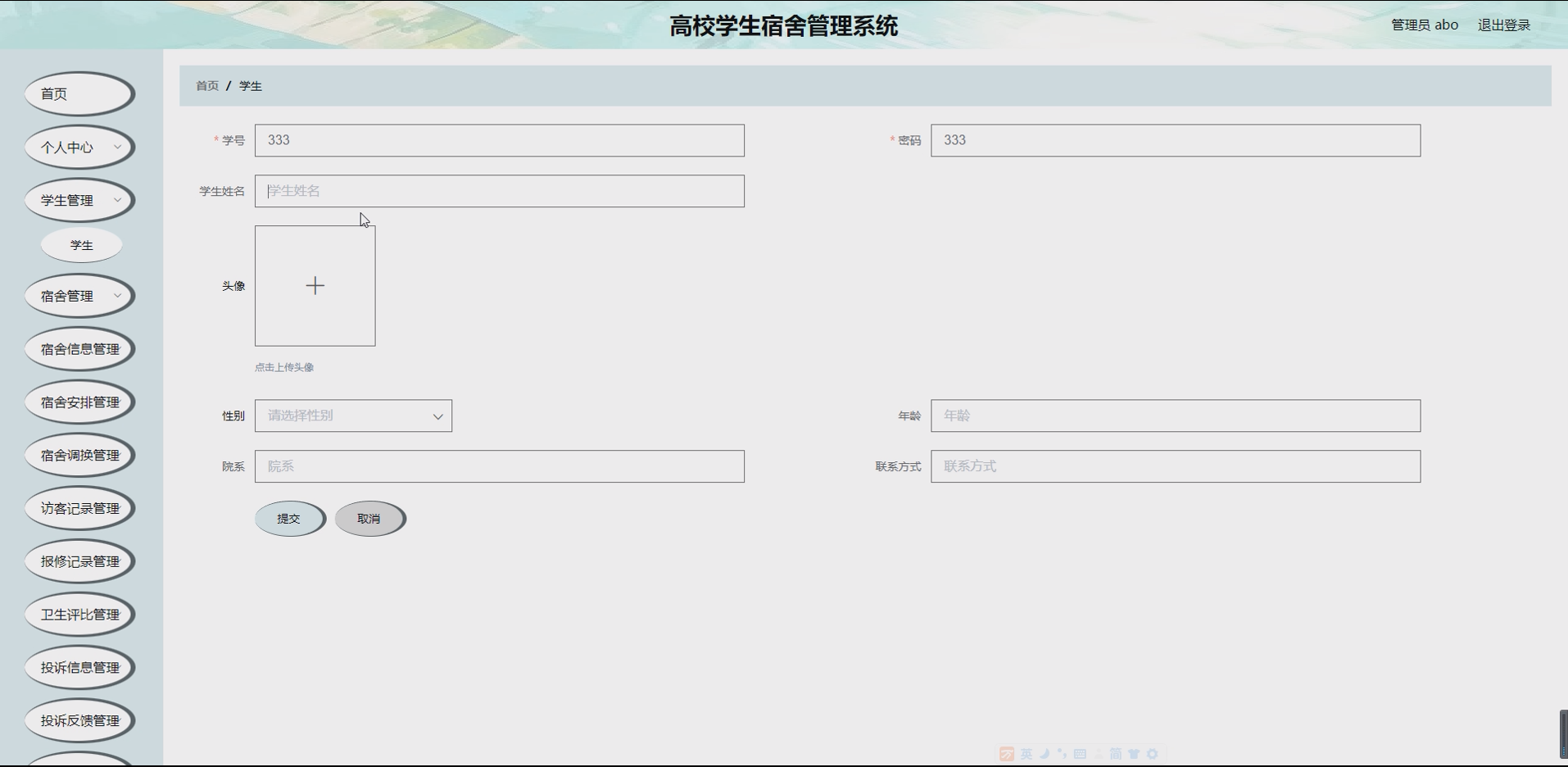 系统项目功能有:学生,宿舍管理,宿舍信息,宿舍安排,宿舍调换,访客记录,报修记录,卫生评比,投诉信息,投诉反馈