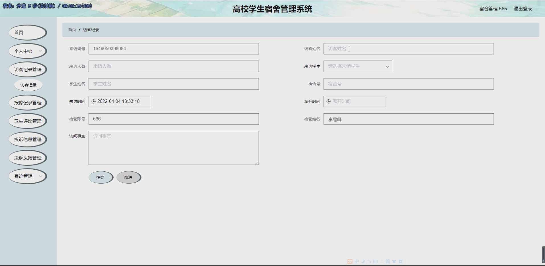 - 功能描述:实现访客信息的登记、查询和管理功能。管理员可登记访客姓名、身份证号、来访时间、来访事由、拜访对象、离开时间等信息,支持按时间、访客姓名、拜访对象等条件查询访客记录,便于宿舍安全管理。