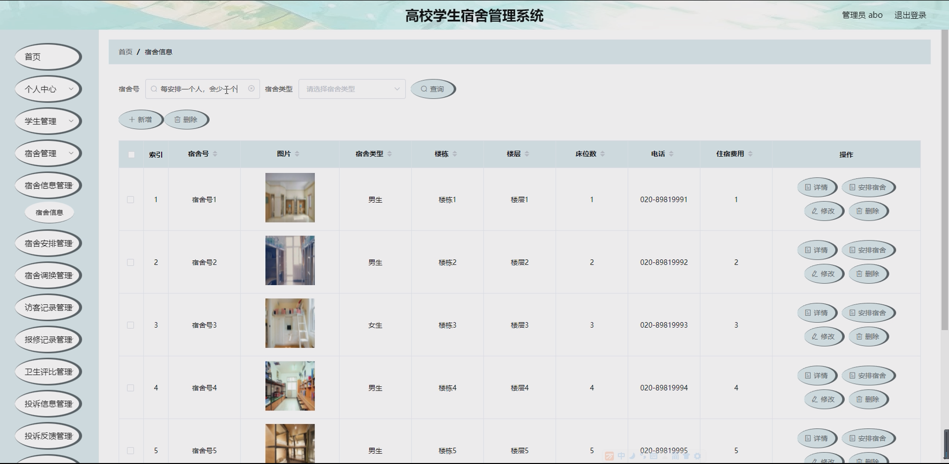 - 数据支持决策:系统能够对宿舍管理过程中的各类数据进行统计分析,为高校后勤管理部门提供准确的数据参考,助力管理者制定科学合理的管理决策。