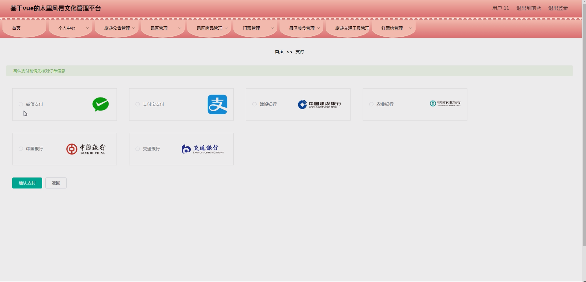 - 游客端:商品浏览(按景区筛选)、商品详情查看、加入购物车、下单支付(对接第三方支付接口)。