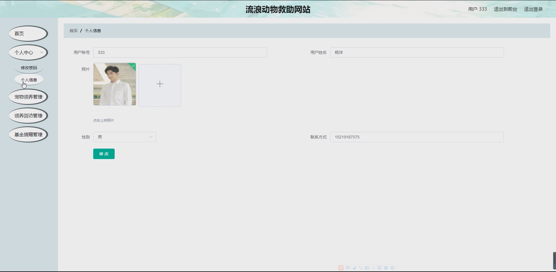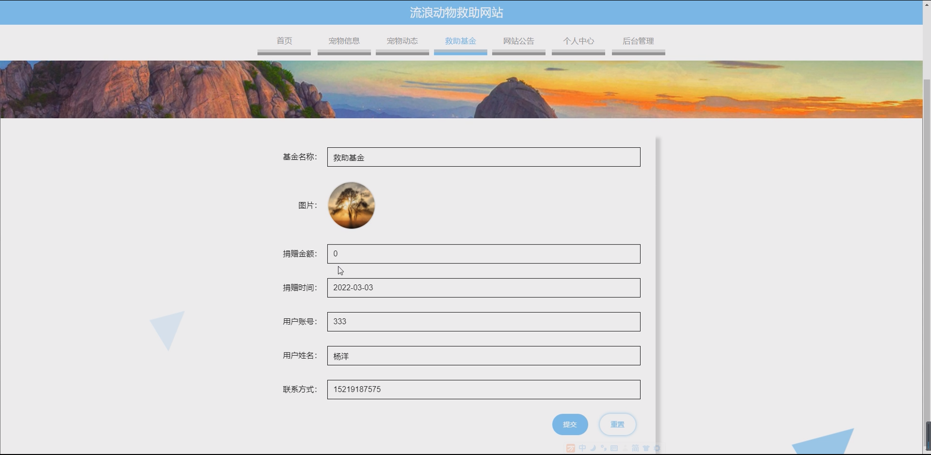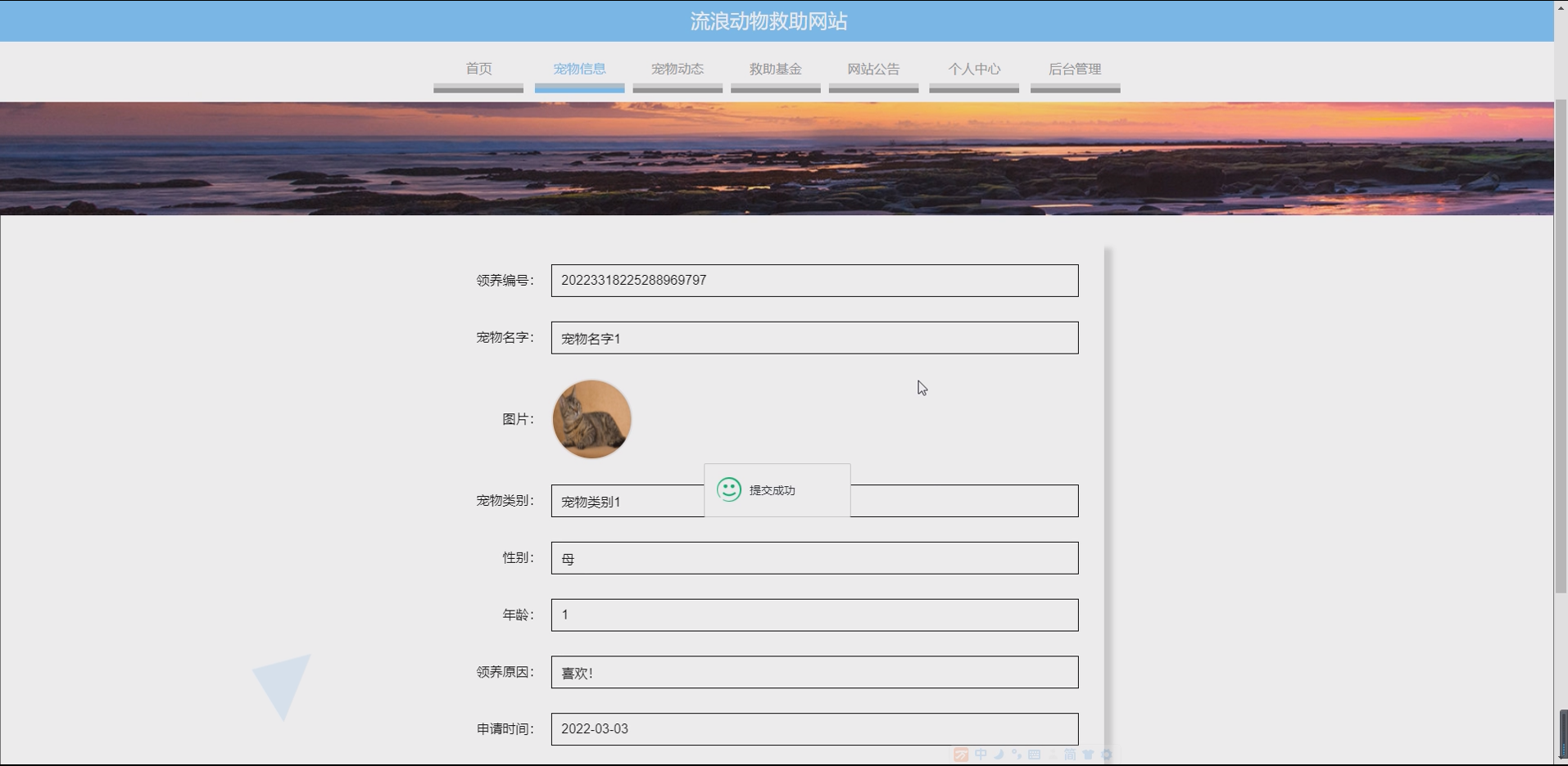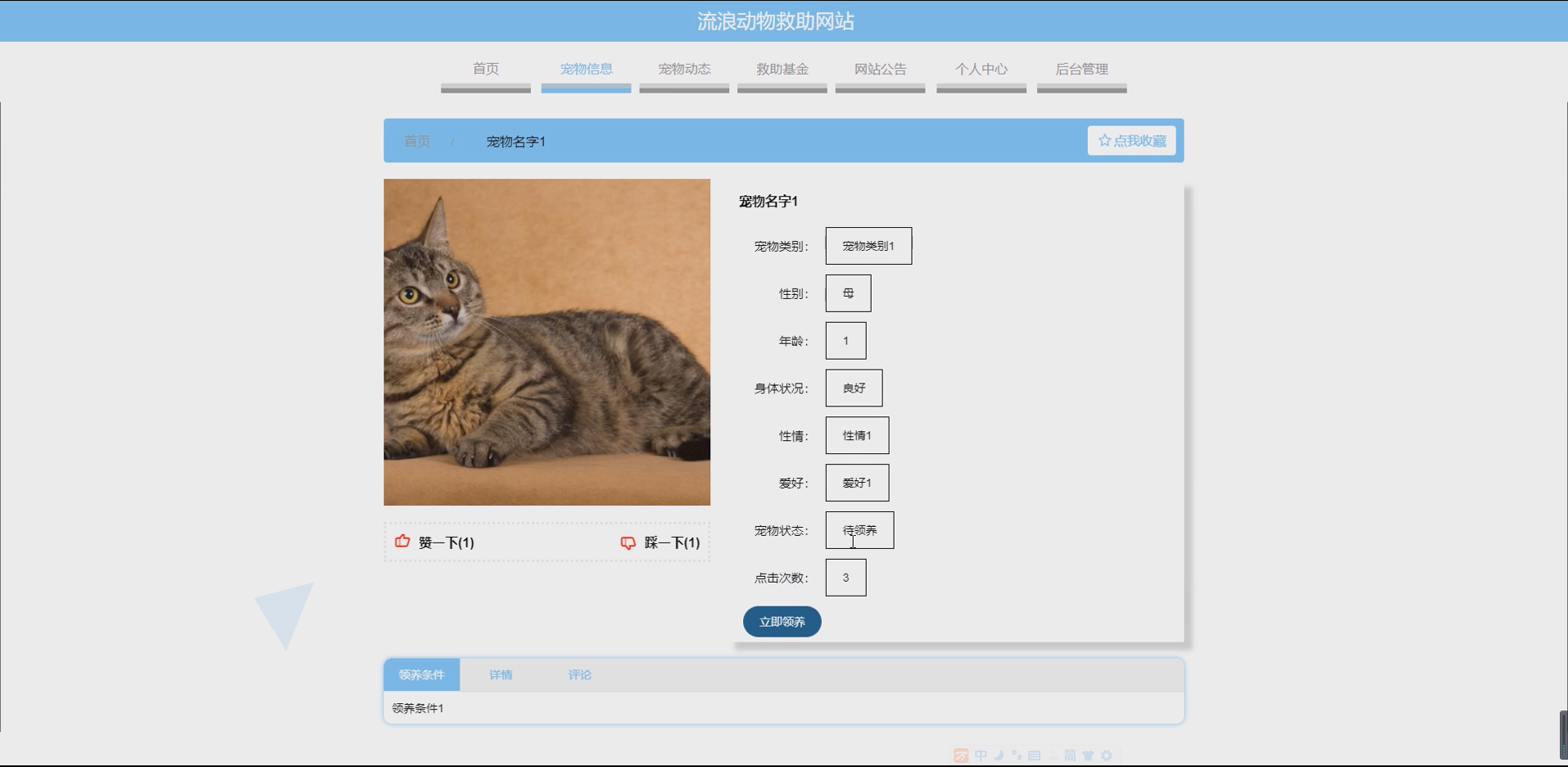 系统项目功能有:用户,宠物类别,宠物信息,宠物领养,宠物动态,救助基金,基金捐赠,领养回访