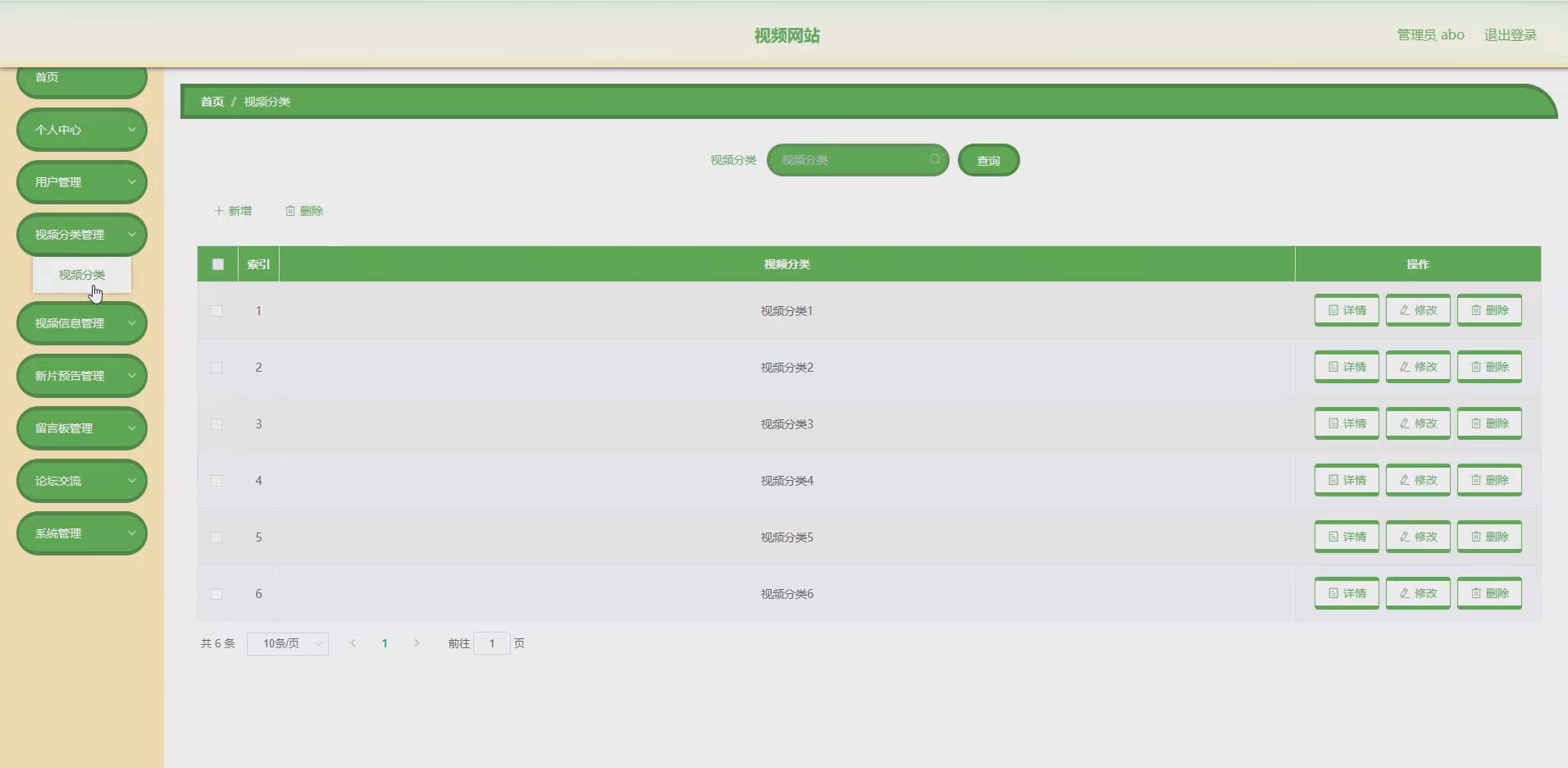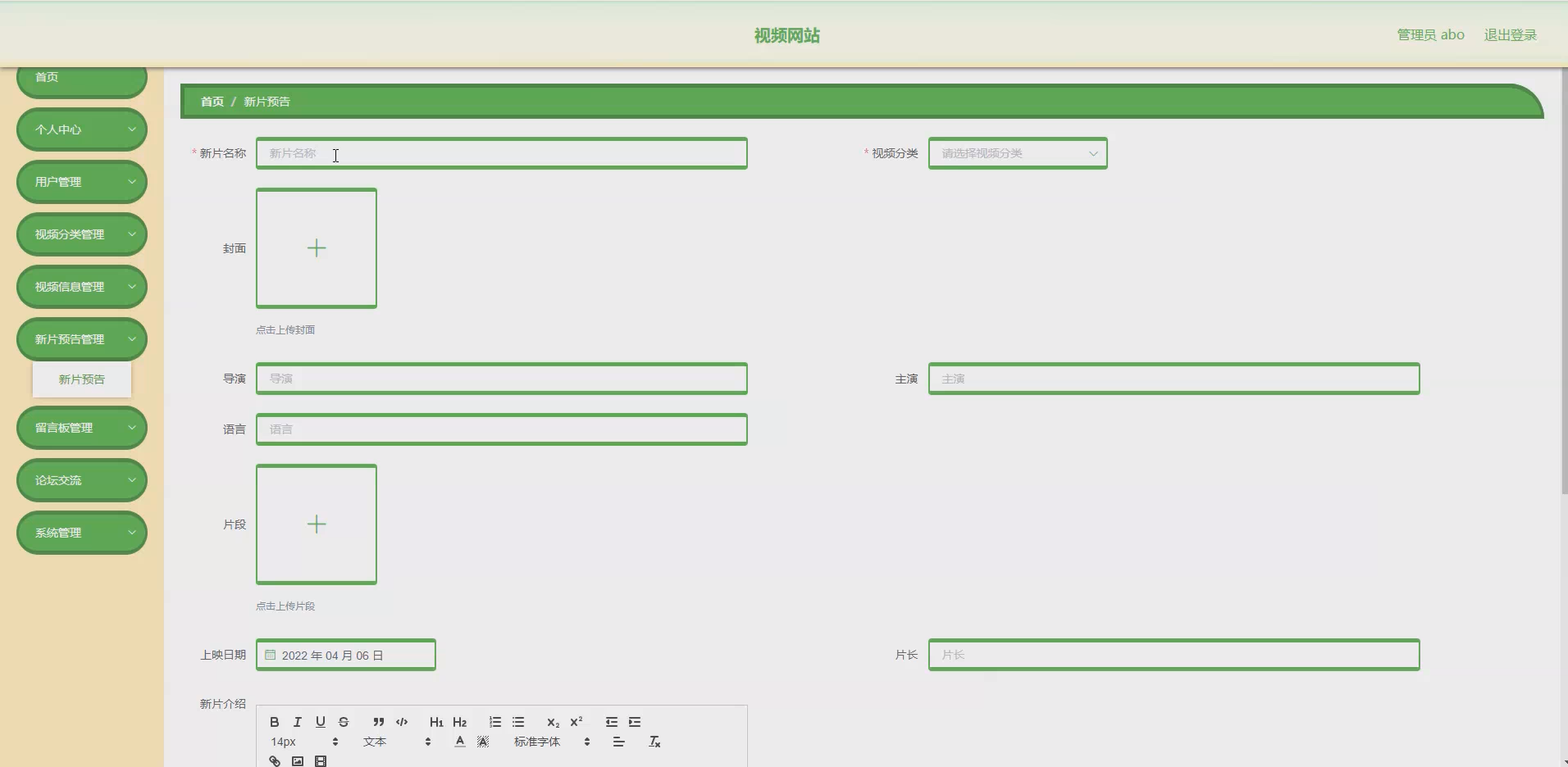 系统项目功能:用户,视频分类,视频信息,新片预告