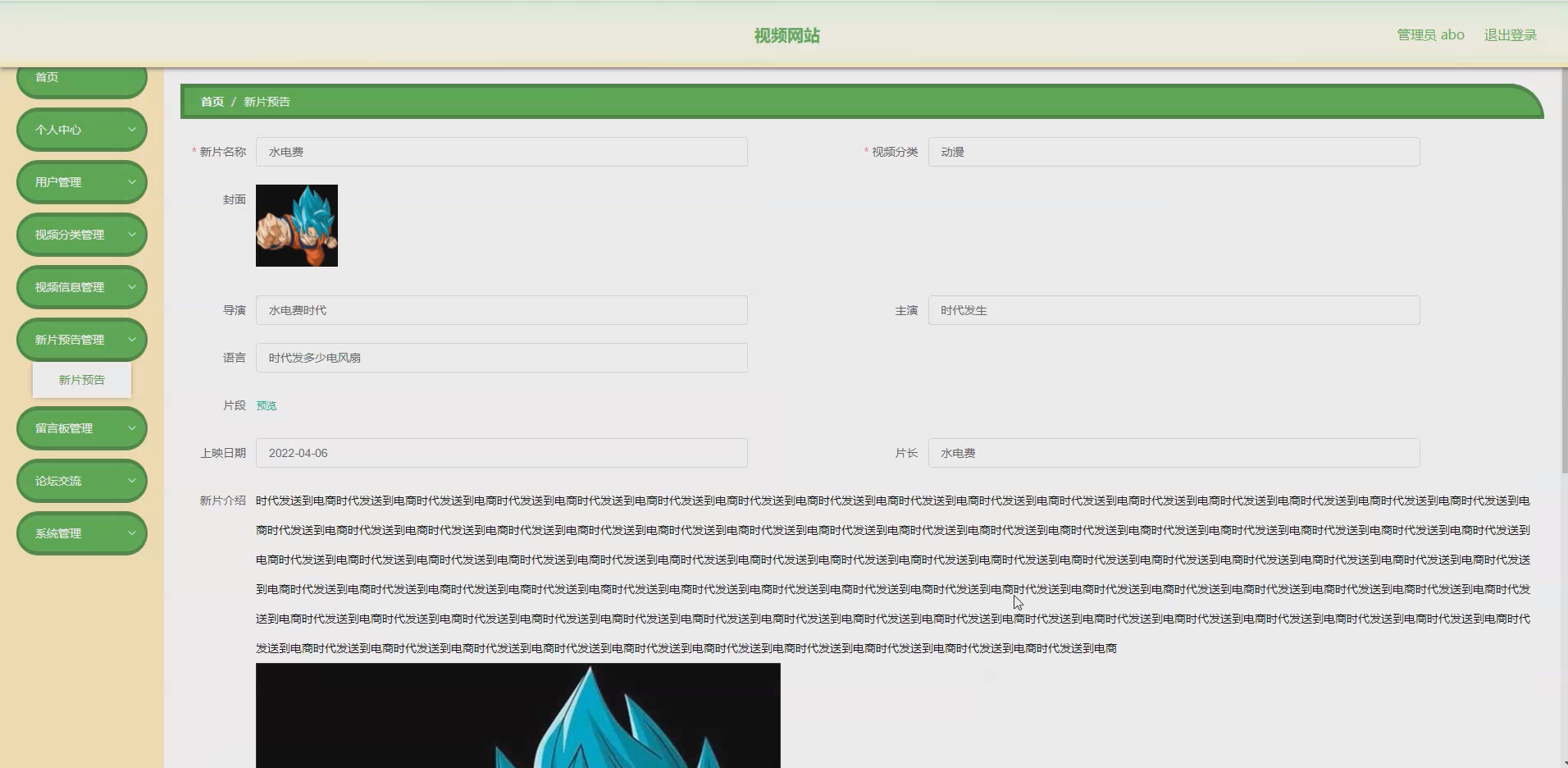视频信息模块:展示视频的详细信息,包括标题、导演、演员、剧情简介、播放次数、评分等。实现视频的播放功能,支持在线播放、暂停、快进等基本操作;同时,提供视频评论、收藏功能,增强用户互动性。