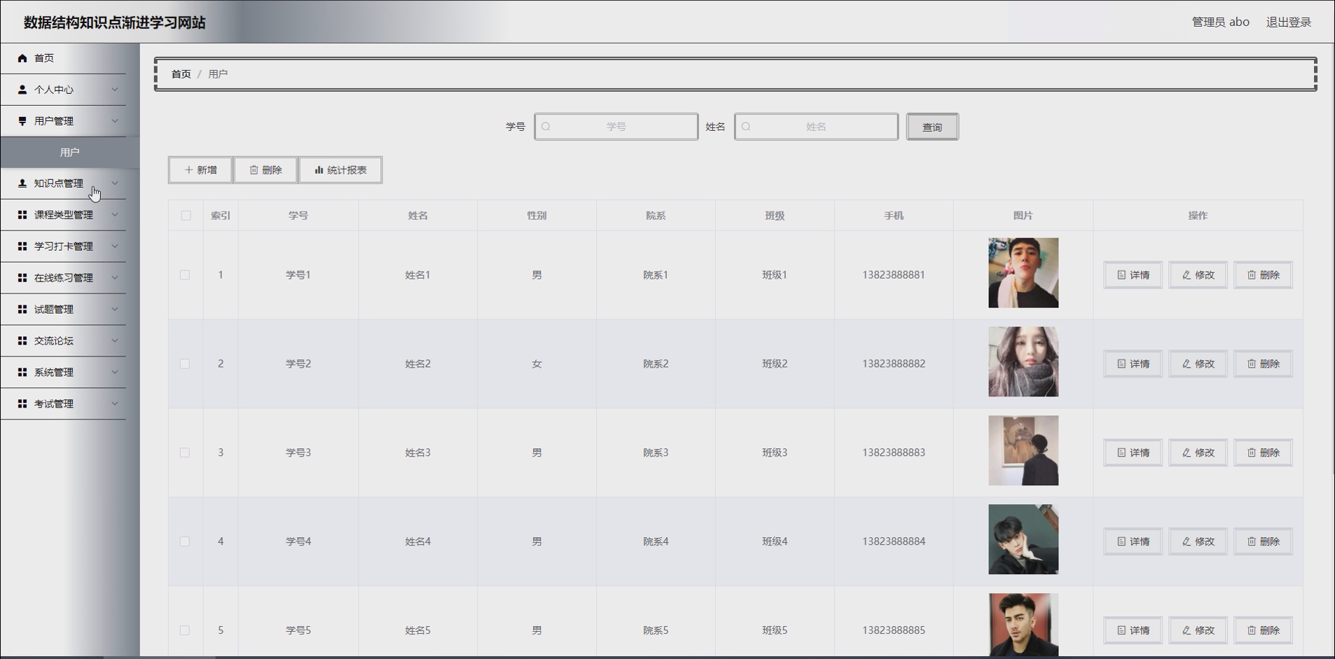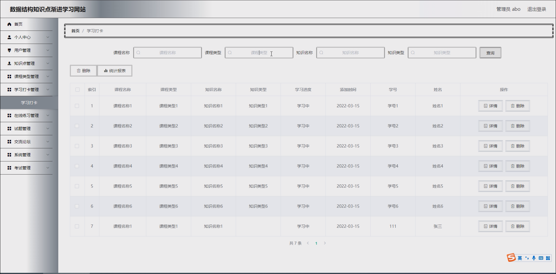 该系统核心定位为“渐进式学习平台”,针对不同基础的用户提供分层知识点内容,通过学习打卡功能强化用户学习习惯,助力用户逐步掌握数据结构核心知识。根据合同约定,系统需实现用户管理、知识点管理、知识类型管理、学习打卡四大核心功能模块,且需满足稳定性、安全性及可扩展性要求。
