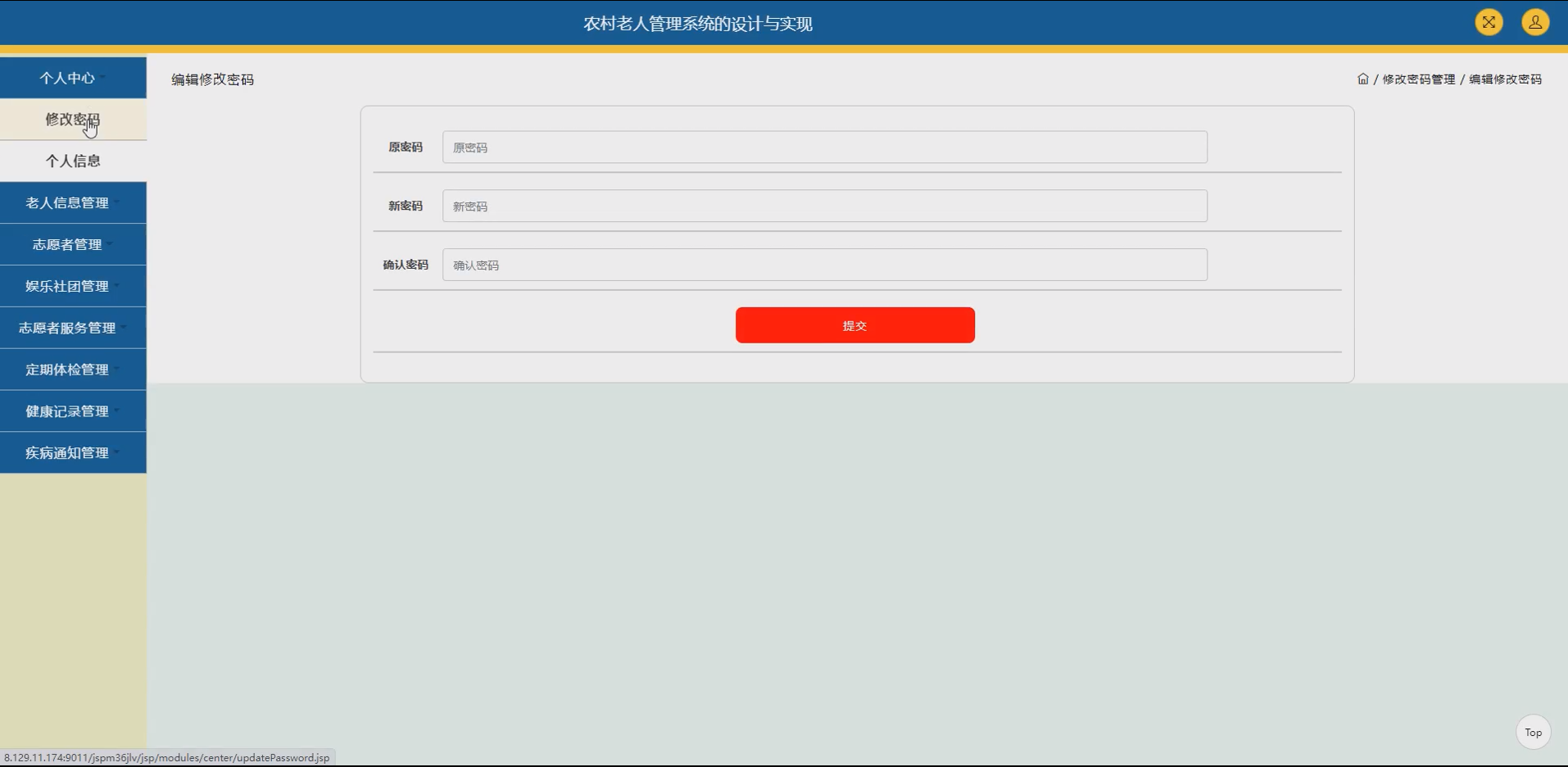 第7-12周:基于SSM框架进行系统编码实现,按模块开发老人信息管理、娱乐社团管理、干部管理、定期体检管理、健康记录管理、疾病通知等功能模块。