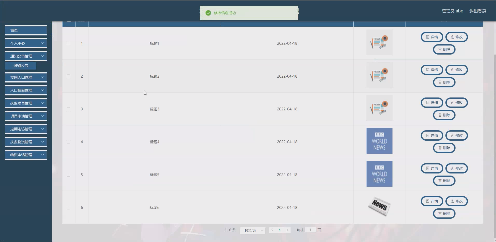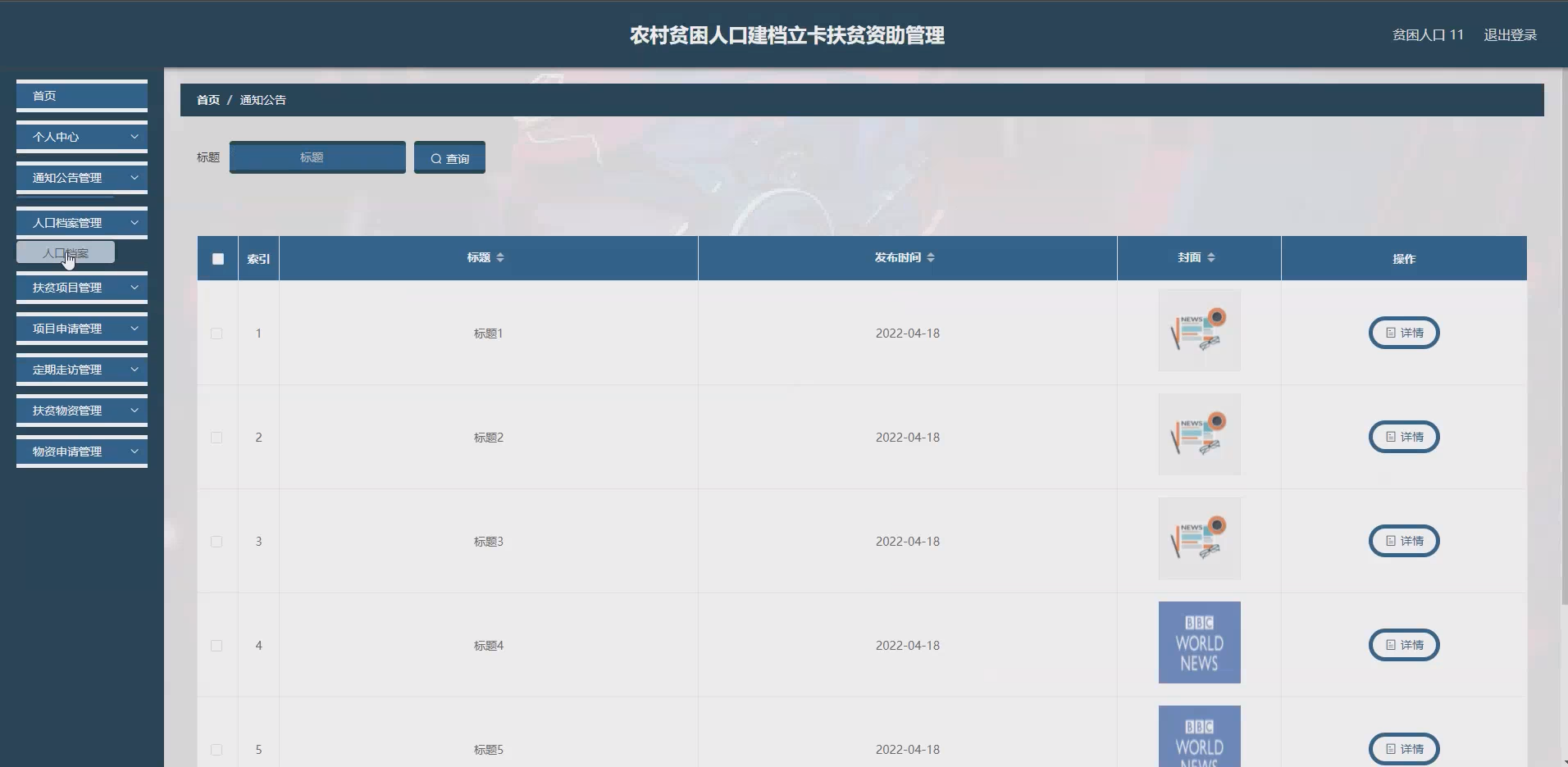 通知公告模块:乡政府发布扶贫政策、会议通知等信息,村委会与贫困人口可实时查看,确保信息传递及时;