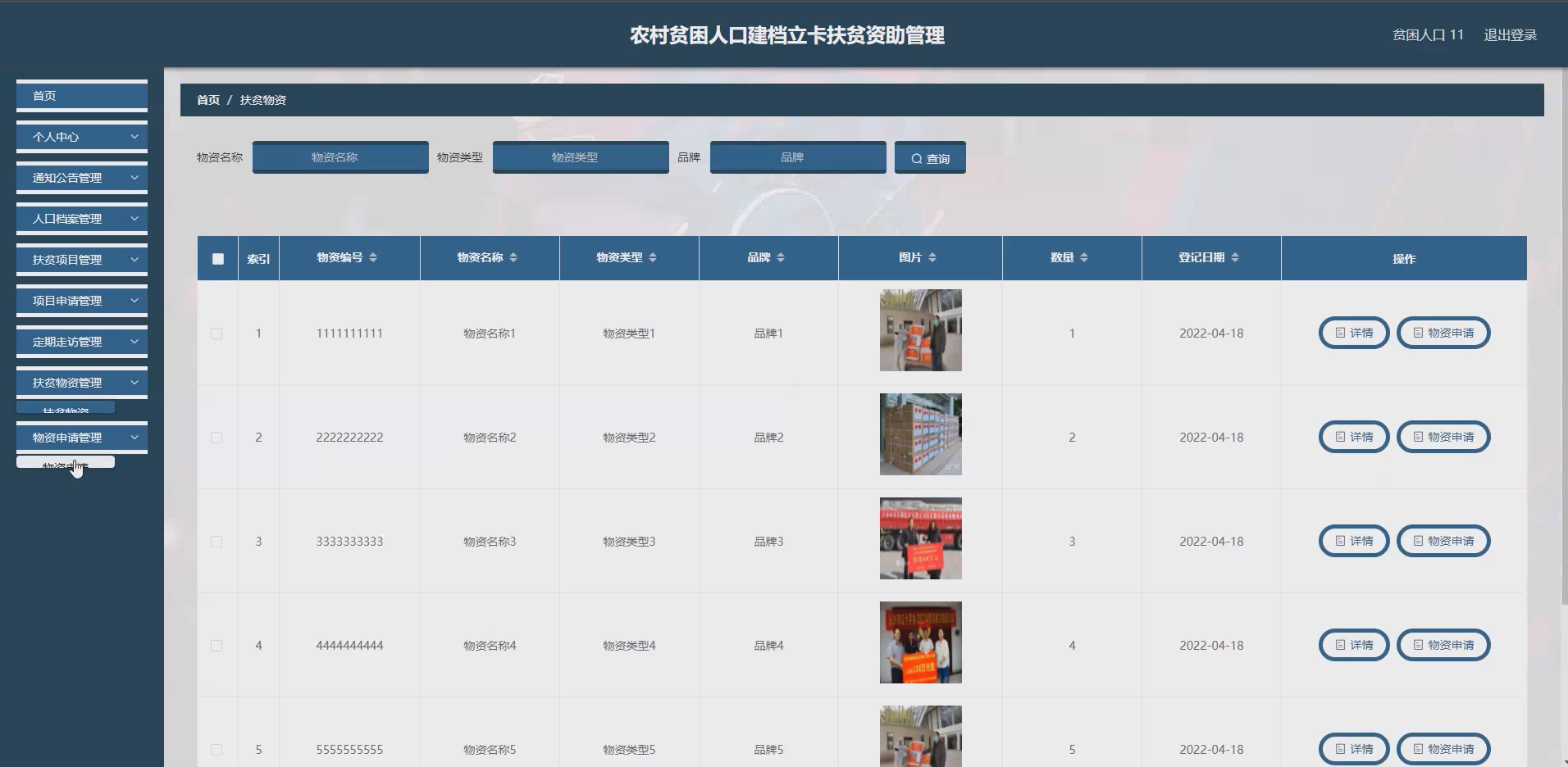物资申请模块:村委会根据贫困人口需求提交物资申请,乡政府审核通过后安排物资发放,实现物资分配的精准化;