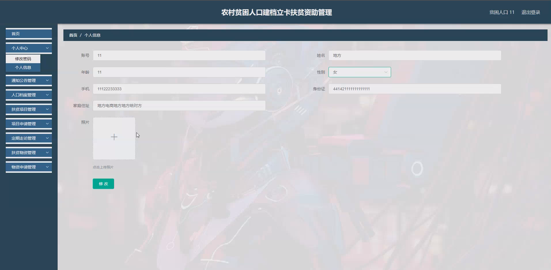 人口档案模块:建立贫困人口电子档案,记录姓名、年龄、家庭住址、贫困原因、收入情况等信息,支持档案的精准查询与动态更新;