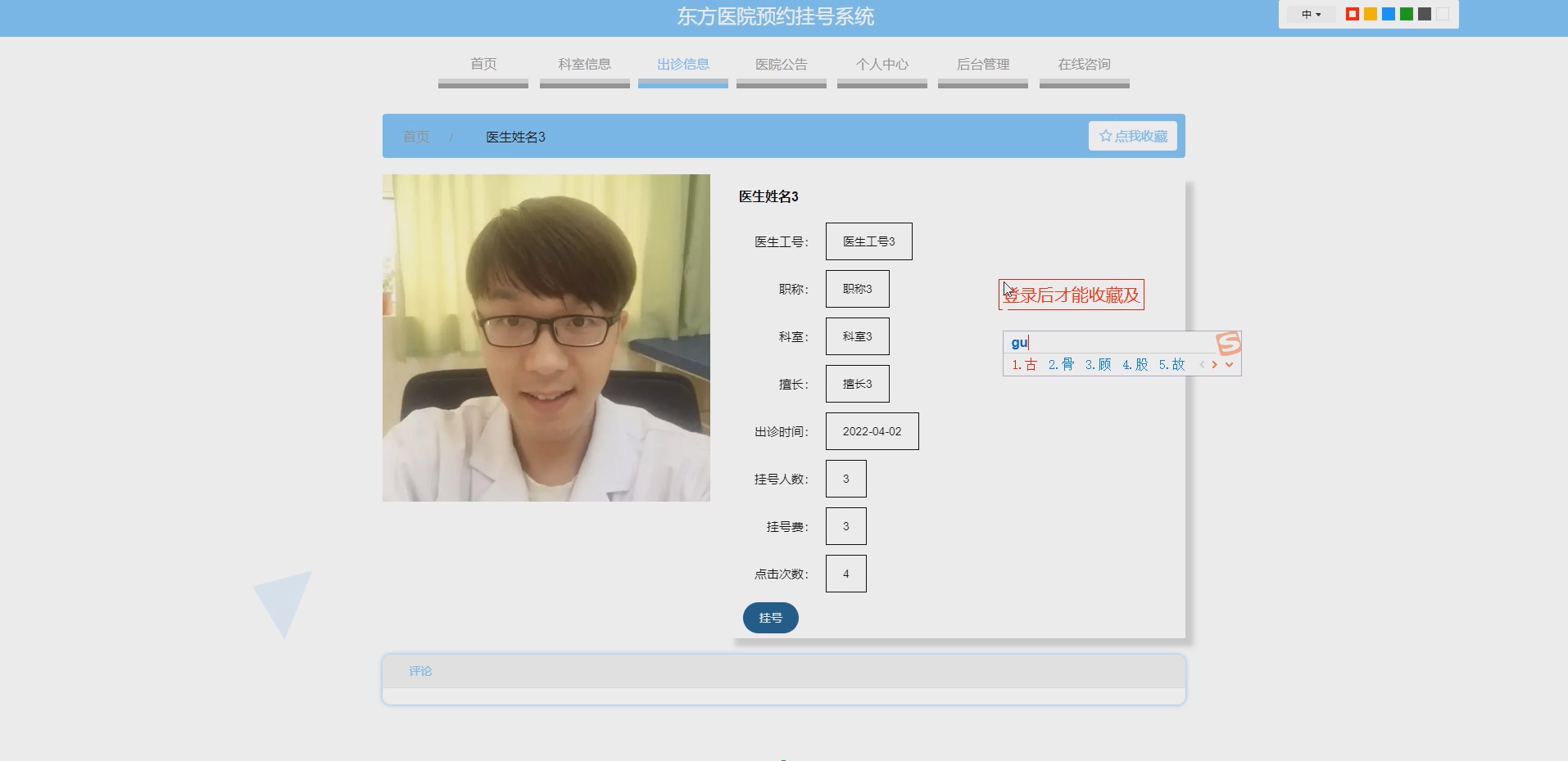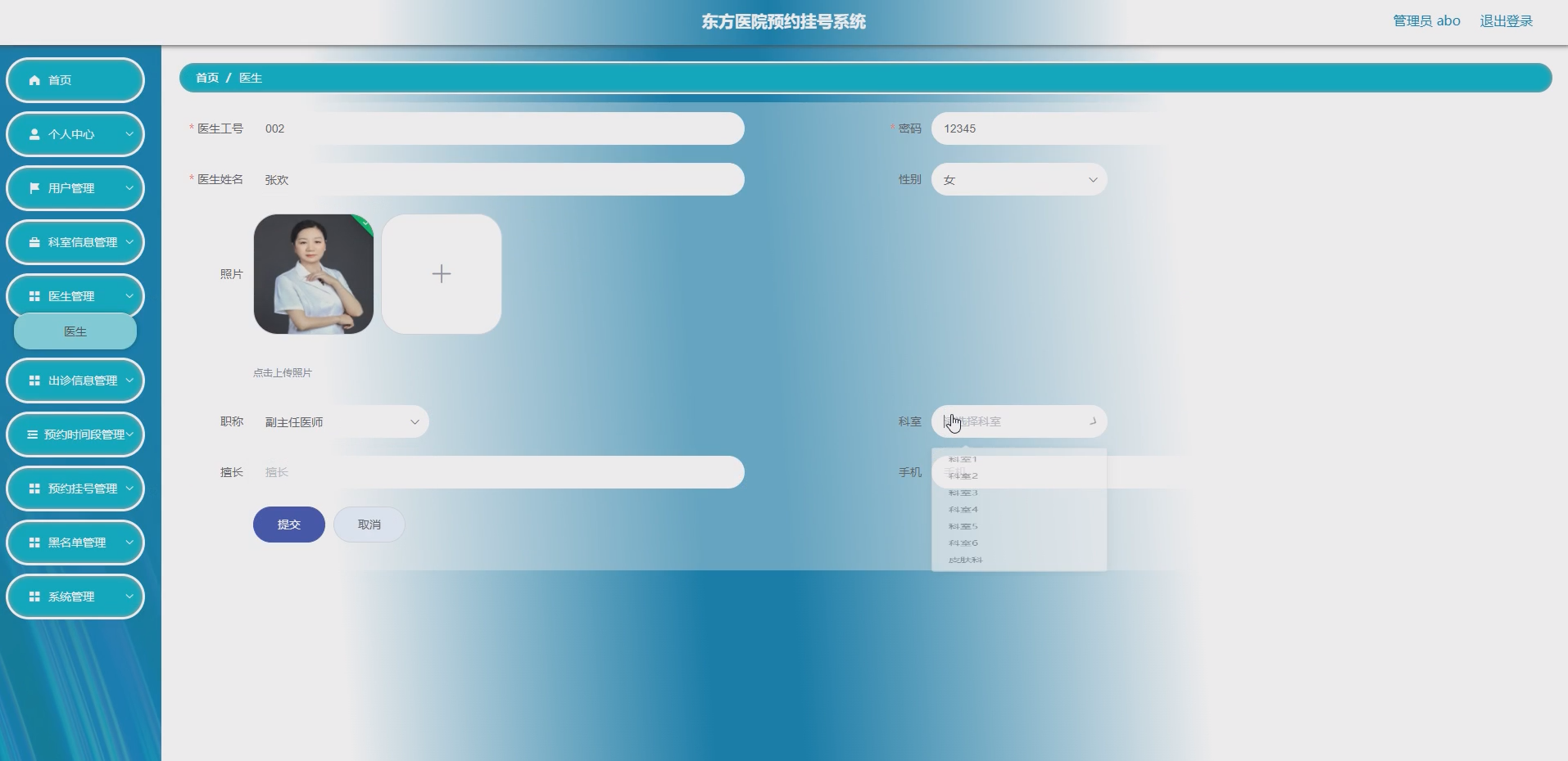 医生管理模块:管理员可添加、修改、删除医生信息,包括医生编号、姓名、所属科室、职称、专业特长等;医生可登录系统查询个人信息,并更新个人简介等内容,方便患者了解医生资质。