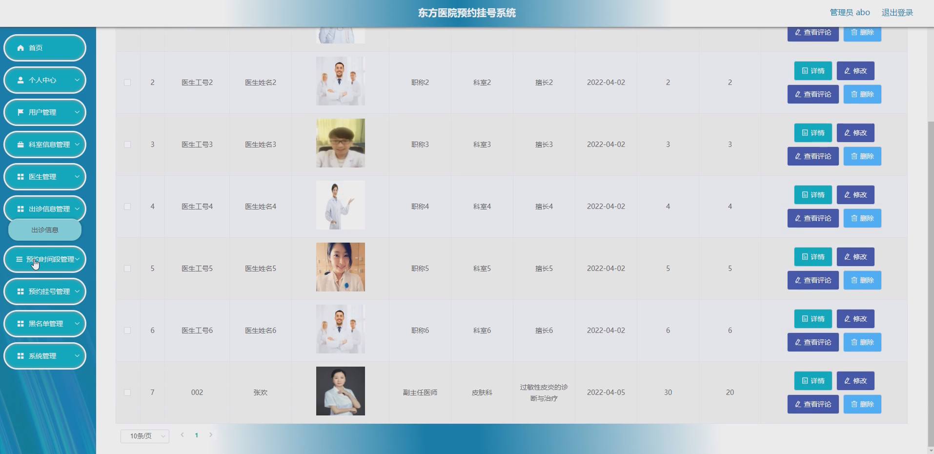系统项目功能:用户,科室信息,医生,出诊信息,预约时间段,预约挂号,黑名单