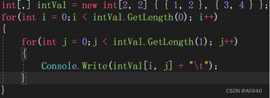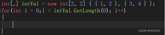 首先定义一个新数组,每定义一个维度数组就要在[]中增加一个“,”,初始化数组,后面的[]里的第一个值表示的是他的维度,第二个值表示每个维度可以存储多少个值,现在创建的就是二维数组,所以第一个[]中只需要写一个“,”,第二个[]中,二维数组,每个数组最多存放两个值。