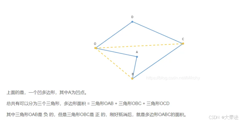 当三角形的面积为正,表示这部分是凸出去的,因为是正的,那么是加到多边形面积的一部分。若三角形的面积为负,表示这部分是凹进来的,那么相当于这部分的面积是需要少掉的,所以时需要从多表现面积中去掉的一部分。