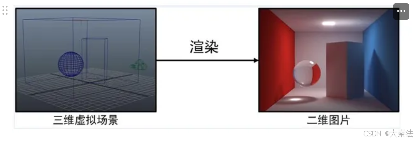 计算机渲染的本质是将三维虚拟场景转化为二维图片。“虚拟场景”包括场景中的几何物体及其附着材质、光源、摄像机。“转化”则对应渲染方法,描述如何从摄像机看到虚拟场景,及虚拟场景如何在摄像机上成像。