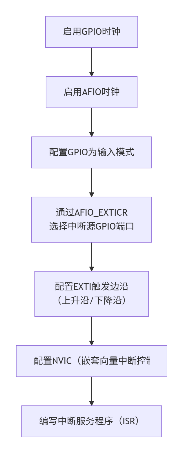 进行外部中断需要对GPIO、AFIO、EXTI、NVIC等进行中断设置。外部中断流程图: