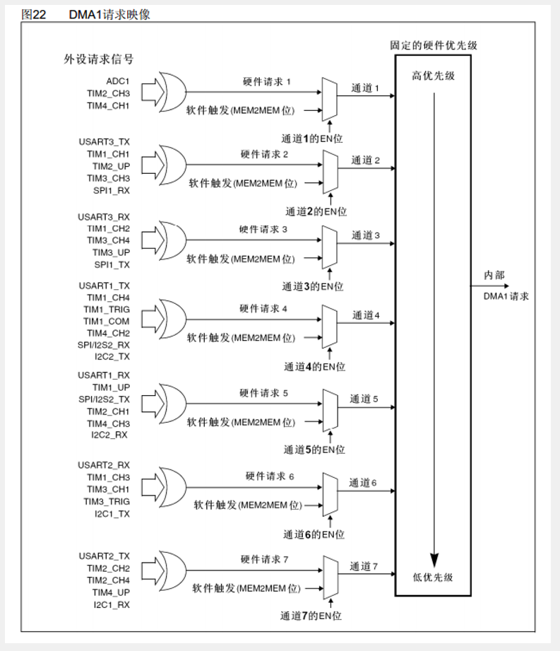 ⑥DMA初始化函数DMA_Init(DMA1_Channel1,&DMA_InitStructure);中第一个参数DMA1_Channel1的DMA1指定了使用DMA1;Channel1指定了使用DMA1的通道1,所以该参数既指定了使用哪个DMA,又指定了使用该DMA的那个通道.