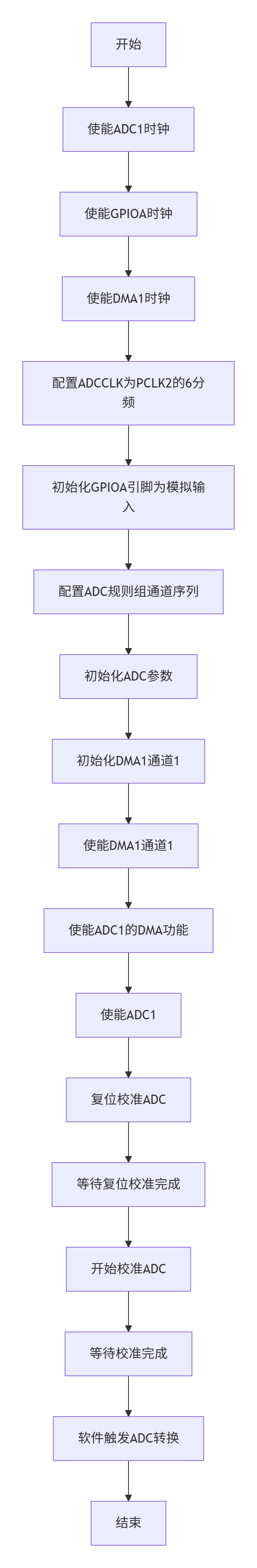 - 根据MyDMA.c文件的DMA配合ADC自动完成数据转运,无需人工干预,流程图如下: