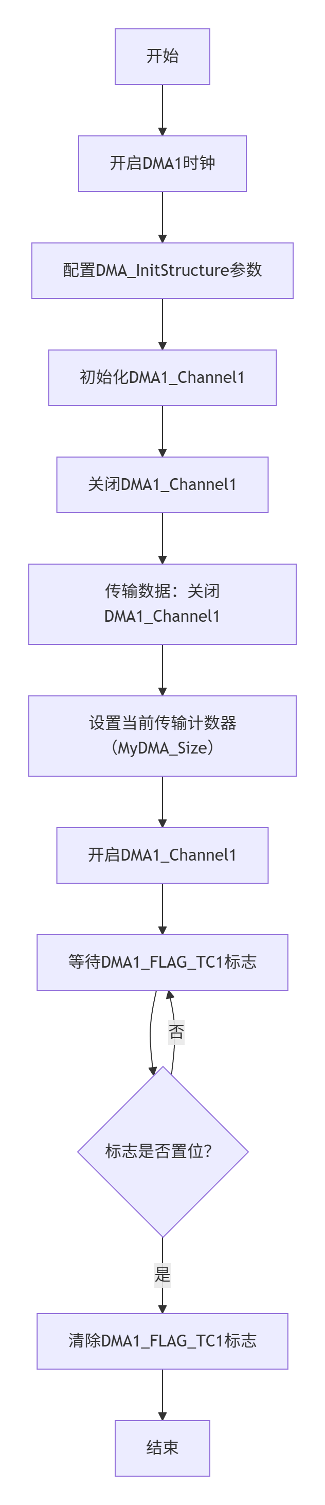 - 根据MyDMA.c代码,单次使用DMA的配置流程如下图: