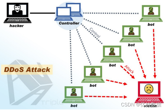 是指处于不同位置的多个攻击者同时向一个或数个目标发动攻击,或者一个攻击者控制了位于不同位置的多台机器并利用这些机器对受害者同时实施攻击。由于攻击的发出点是分布在不同地方的,这类攻击称为分布式拒绝服务攻击, 其中的攻击者可以有多个。