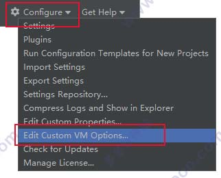 8、单击IDE菜单“Configure配置” - >“Edit Custom VM Options编辑自定义VM选项...”