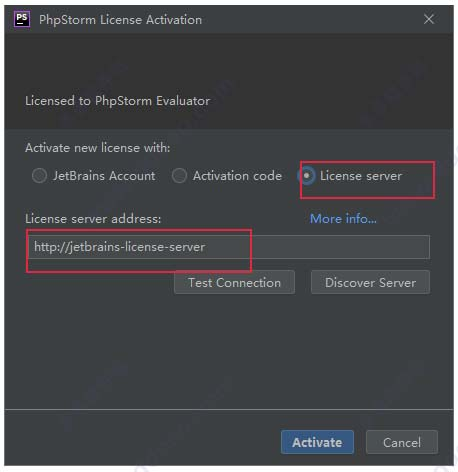 11、用户可以选择"License server" ,输入服务器地址:【http://jetbrains-license-server】再点击activate;