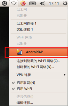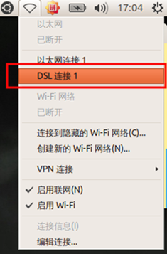 (4)开启连接。打开右上角的网络配置图标,此时会看到一个DSL连接1,点击进行连接。