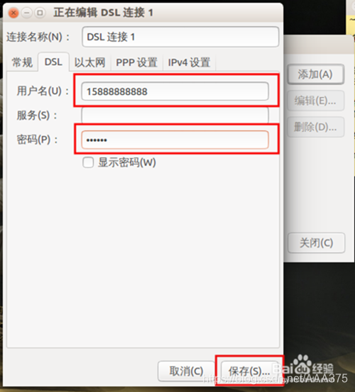 (3)保存连接。填写用户名与密码,点击保存,此时可在网络连接中发现新创建的DSL连接1。