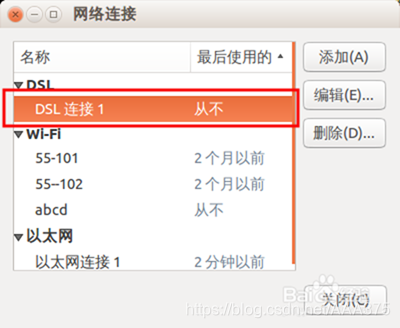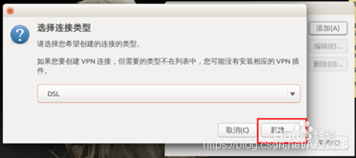 (2)添加连接。单击网络连接中的,添加找到并选中DSL,新建DSL连接。