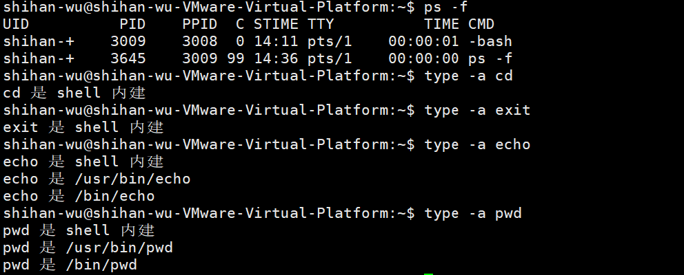 |内建与外部命令|内建命令内置 Shell 效率高(cd、echo 等 ),外部命令需新进程(ls 等 )|type cd 、type ls 验证;执行对应命令体验|
