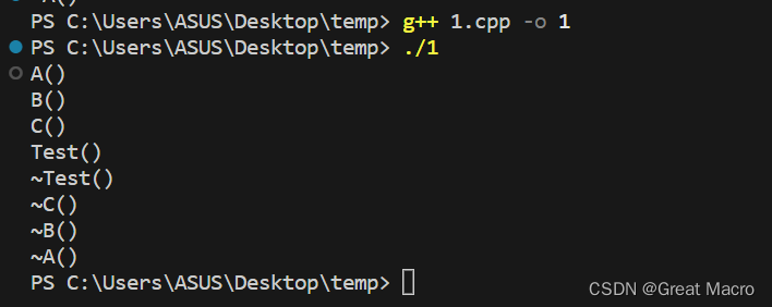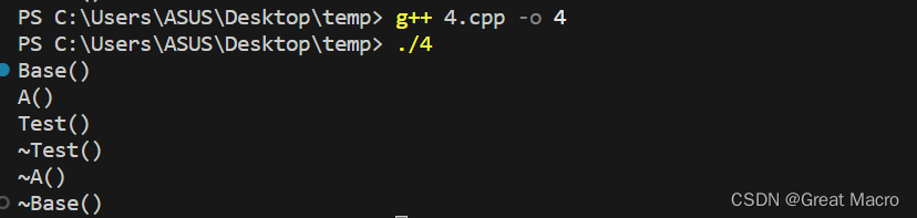 #include <iostream> using namespace std; class A { public: A() { cout << "A()" << endl; } ~A() { cout << "~A()" << endl; } }; class B { public: B() { cout << "B()" << endl; } ~B() { cout << "~B()" << endl; } }; class C { public: C() { cout << "C()" << endl; } ~C() { cout << "~C()" << endl; } }; // 构造函数初始化顺序是 A, B, C, Test class Test:public A, public B, public C { public: Test() { cout << "Test()" << endl; } ~Test() { cout << "~Test()" << endl; } }; int main() { Test a; return 0; }