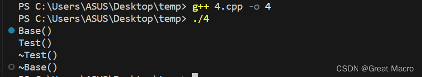 #include <iostream> using namespace std; // 基类 class Base { public: Base() { cout << "Base()" << endl; } ~Base() { cout << "~Base()" << endl; } }; // 公有继承 class Test:public Base { public: Test() { cout << "Test()" << endl; } ~Test() { cout << "~Test()" << endl; } }; int main() { Test a; return 0; }