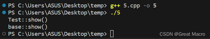 #include <iostream> using namespace std; class base { private: int a; public: base(int a = 0) { this->a = a; } void show() { cout << "base::show()" << endl; } }; class Test:public base { public: Test(int a = 0):base(a) { } void show() { cout << "Test::show()" << endl; } }; int main() { Test a(10); a.show(); // 调用Test::show() a.base::show(); // 调用base::show() return 0; }