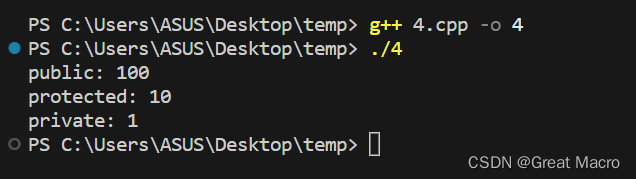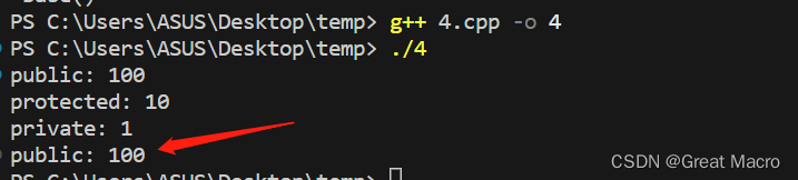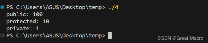 #include <iostream> using namespace std; // 基类 class Base { private: int base_private; protected: int base_protected; public: int base_public; Base(int a = 0, int b = 0, int c = 0) { // cout << "Base()" << endl; this->base_private = a; this->base_protected = b; this->base_public =c; } ~Base() { // cout << "~Base()" << endl; } int getPrivate()const { return base_private; } }; // 保护继承 class Test:protected Base { public: // 派生类的中基类成员的初始化采用,构造函数参数列表的方式 Test(int a = 0, int b = 0, int c = 0):Base(a, b, c) { // cout << "Test()" << endl; } ~Test() { // cout << "~Test()" << endl; } void show()const { // 基类成员的属性为公有的,保护继承后,属性变成保护 cout << "public: " << base_public << endl; // 基类成员的属性为保护的,保护继承后,保持不变 cout << "protected: " << base_protected << endl; // 基类成员的属性为私有,保护继承后,在派生类和类外都不可见 // cout << "private: " << base_private << endl; cout << "private: " << getPrivate() << endl; } }; int main() { Test a(1, 10, 100); a.show(); // cout << "public: " << a.base_public << endl; // 保护,类外不可以访问 return 0; }
