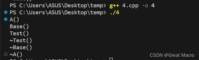 #include <iostream> using namespace std; class A { public: A() { cout << "A()" << endl; } ~A() { cout << "~A()" << endl; } }; // 基类 class Base { A a; // 基类中内嵌子对象 public: Base() { cout << "Base()" << endl; } ~Base() { cout << "~Base()" << endl; } }; // 公有继承 class Test:public Base { public: Test() { cout << "Test()" << endl; } ~Test() { cout << "~Test()" << endl; } }; int main() { Test a; return 0; }