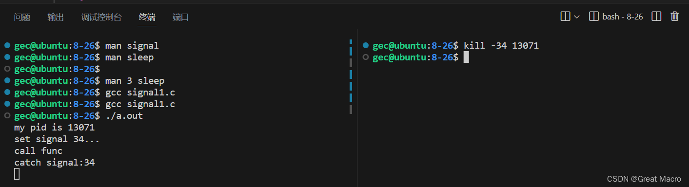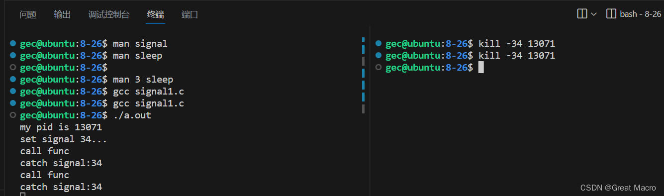 // 信号的捕捉操作示例 #include <stdio.h> #include <unistd.h> #include <signal.h> void func(int sig) { printf("call func\n"); printf("catch signal:%d\n", sig); } int main(int argc, char *argv[]) { // 设置信号响应函数,捕捉34号信号,当捕获到34号信号时,执行func函数 // 注意设置后,不会执行func函数,signal()应该尽量写在前面 signal(34, func); printf("my pid is %d\n", getpid()); // 打印本进程ID号,方便从命令行发送信号 printf("set signal 34...\n"); while(1) { sleep(1); } return 0; }