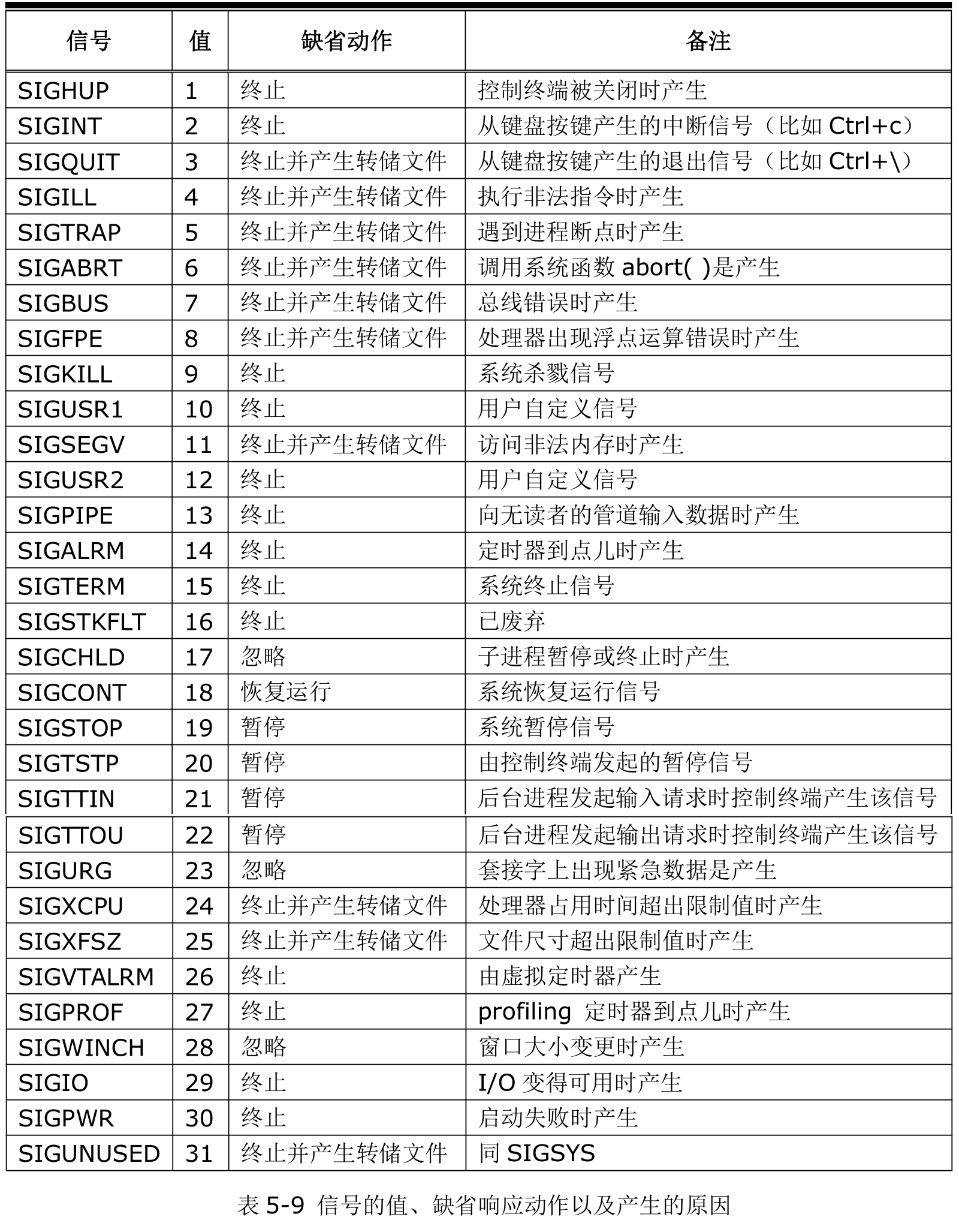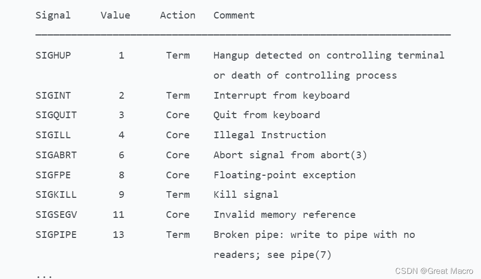 如果程序没有对信号做任何预先准备,那么当信号到达时,则会按照信号的默认规则进行响应,具体默认规则可使用如下命令查阅: