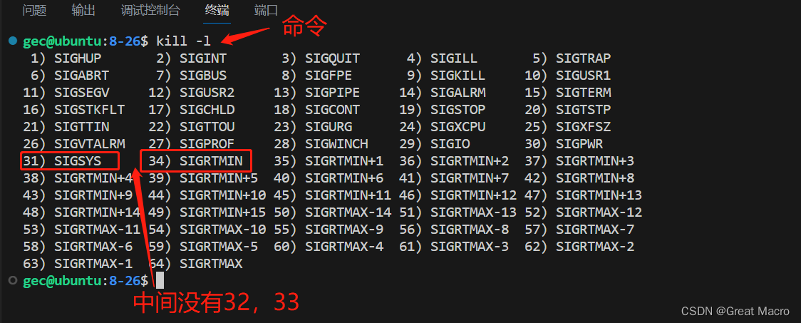 Linux/Unix系统下,信号总共分成两大类,一类是最常用的标准信号,另一类是后面的引入的实时信号。一共有62个信号,前31个是标准信号,后面31个是实时信号。注意没有32,33号。