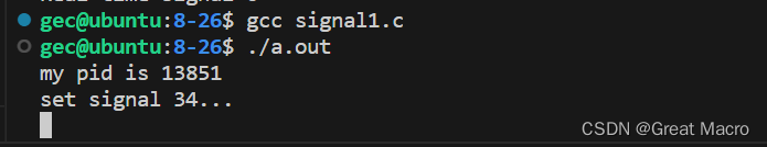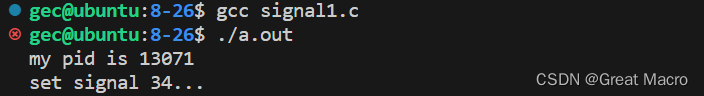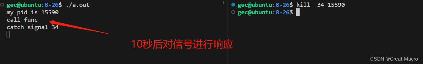 // 信号的捕捉操作示例 #include <stdio.h> #include <unistd.h> #include <signal.h> void func(int sig) { printf("call func\n"); printf("catch signal:%d\n", sig); } int main(int argc, char *argv[]) { printf("my pid is %d\n", getpid()); // 打印本进程ID号,方便从命令行发送信号 printf("set signal 34...\n"); while(1) { sleep(1); } // 如果放在这里注册信号响应函数,也能捕捉到信号,但是会有意想不到的结果 signal(34, func); return 0; }