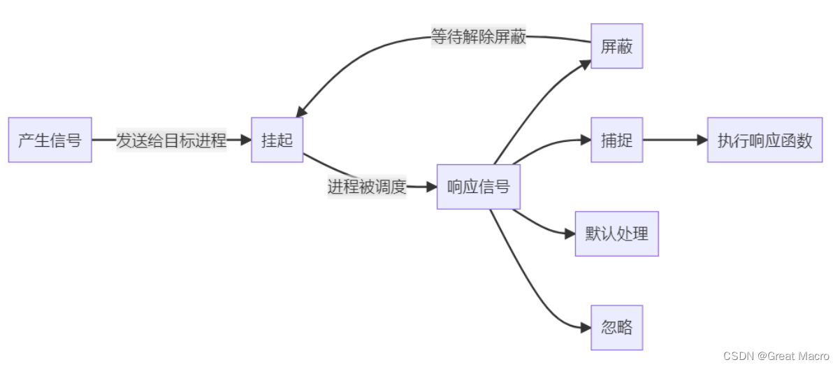 所谓信号的生命周期,指的是信号从产生到被响应完毕的整个过程,这个过程可被描述为: