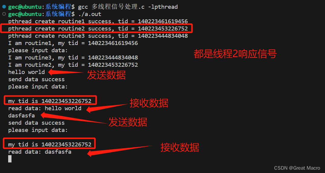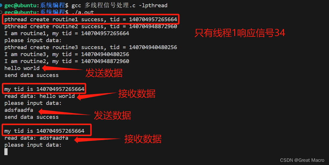 1、使用线程结合信号的方式完成数据的接收和发送,要求一条线程发送数据同时发送信号指定某条线程接收数据,另外有多余线程做伪任务。