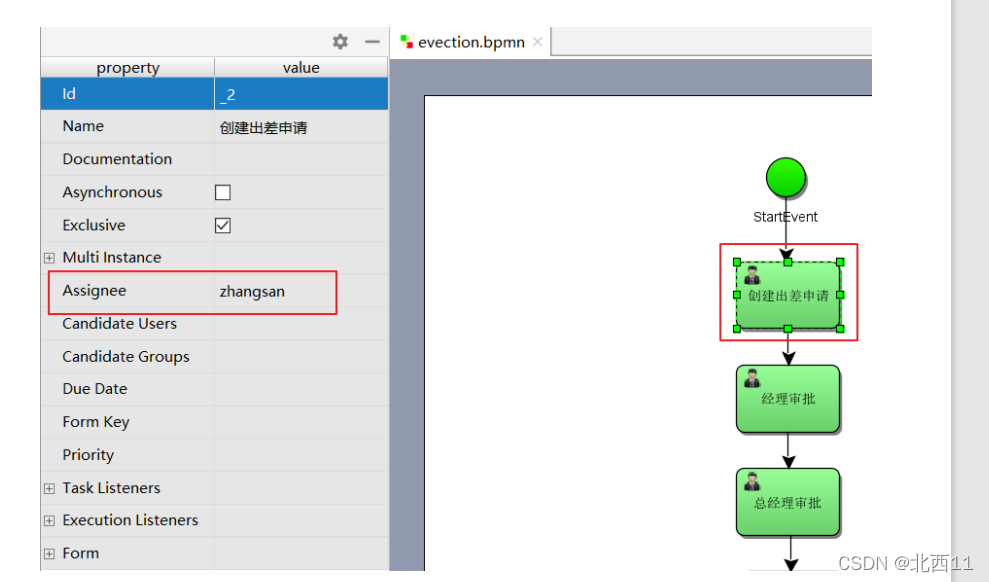 在properties视图指定每个任务结点的负责人 如:填写出差申请的负责人为 zhangsan