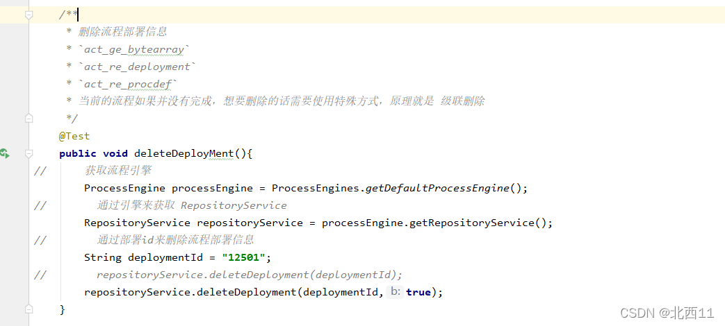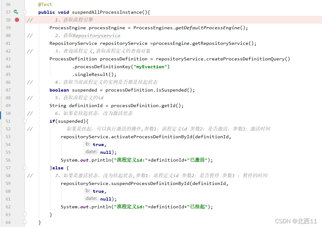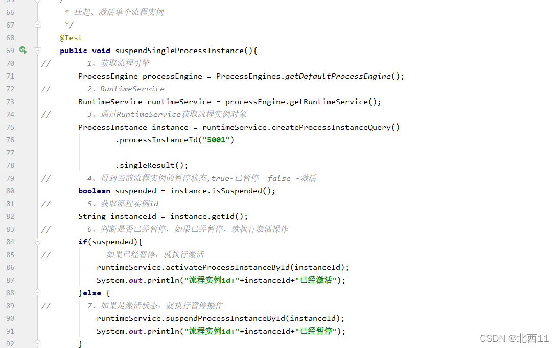 操作流程实例对象,针对单个流程执行挂起操作,某个流程实例挂起则此流程不再继续执行,完成该流程实例的当前 任务将报异常。