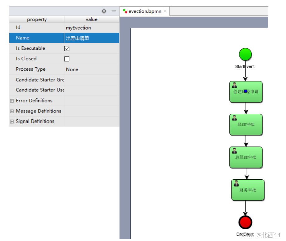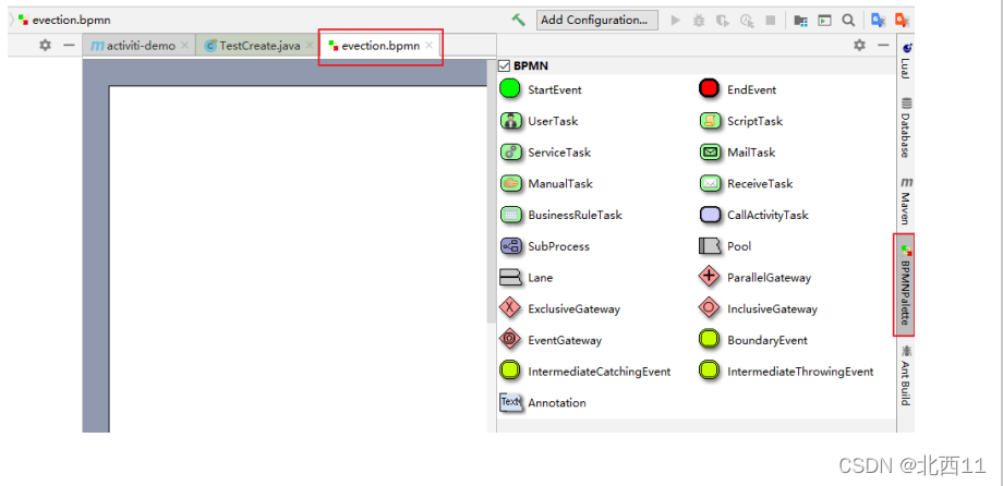 起完名字evection后(默认扩展名为bpmn),就可以看到流程设计页面,如图所示: