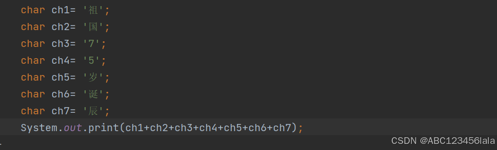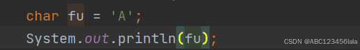 Java 中使用 单引号 + 单个字母 的形式表示字符字面值.计算机中的字符本质上是一个整数. 在 C语言中使用 ASCII 表示字符, 而 Java 中使用 Unicode 表示字符. 因此一个字符占用两个字节, 表示的字符种类更多, 包括中文。