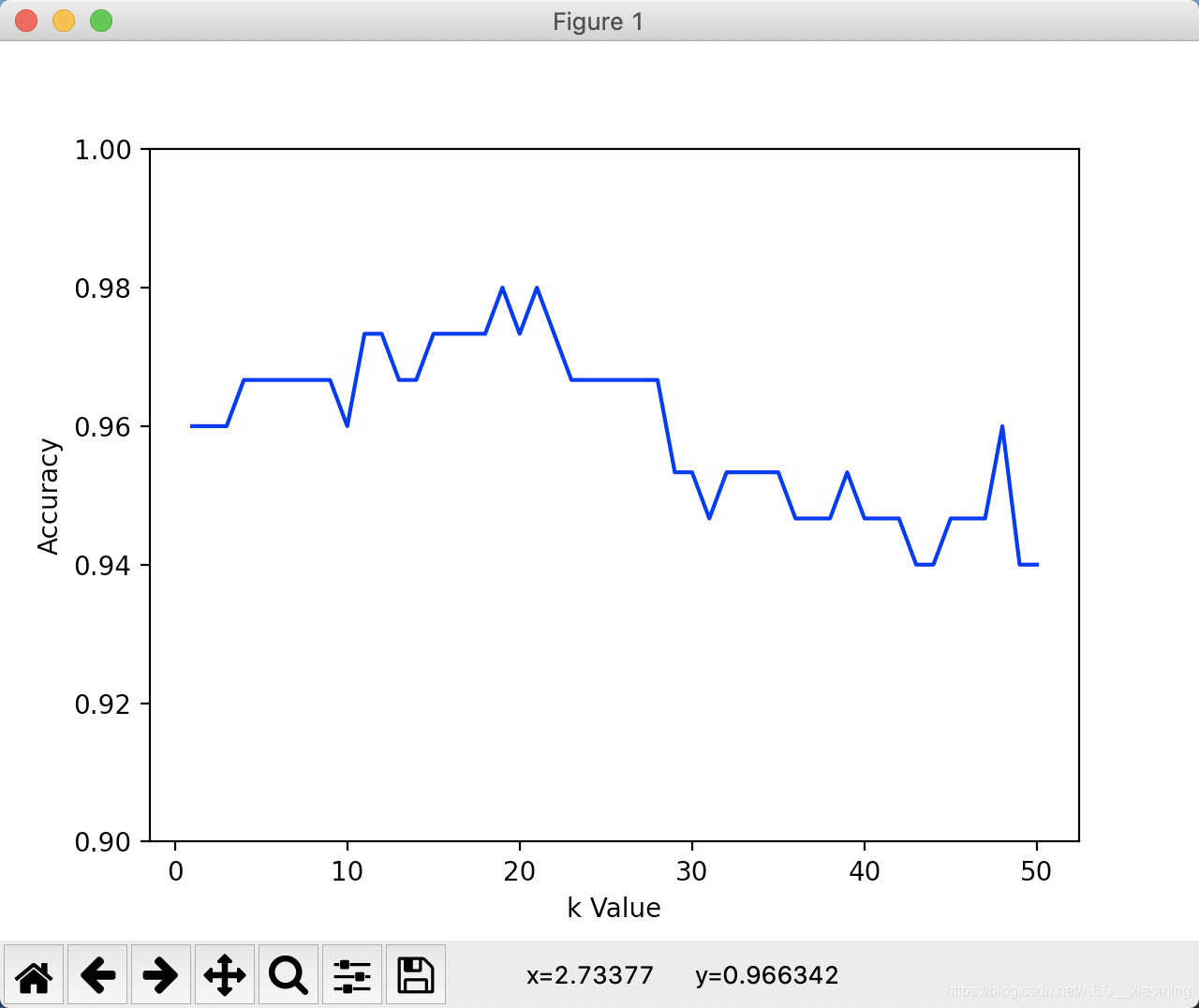 最后给大家看看不同的K值和正确率的关系图:
