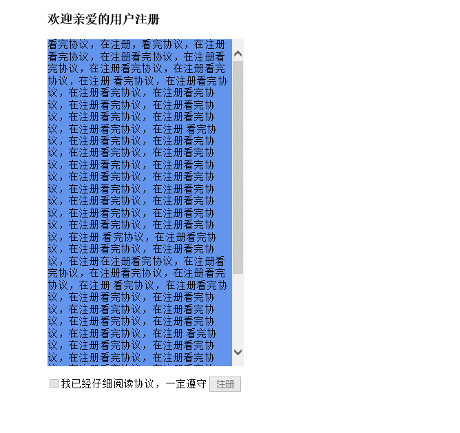 <input type="checkbox" disabled="disabled"/>我已经仔细阅读协议,一定遵守