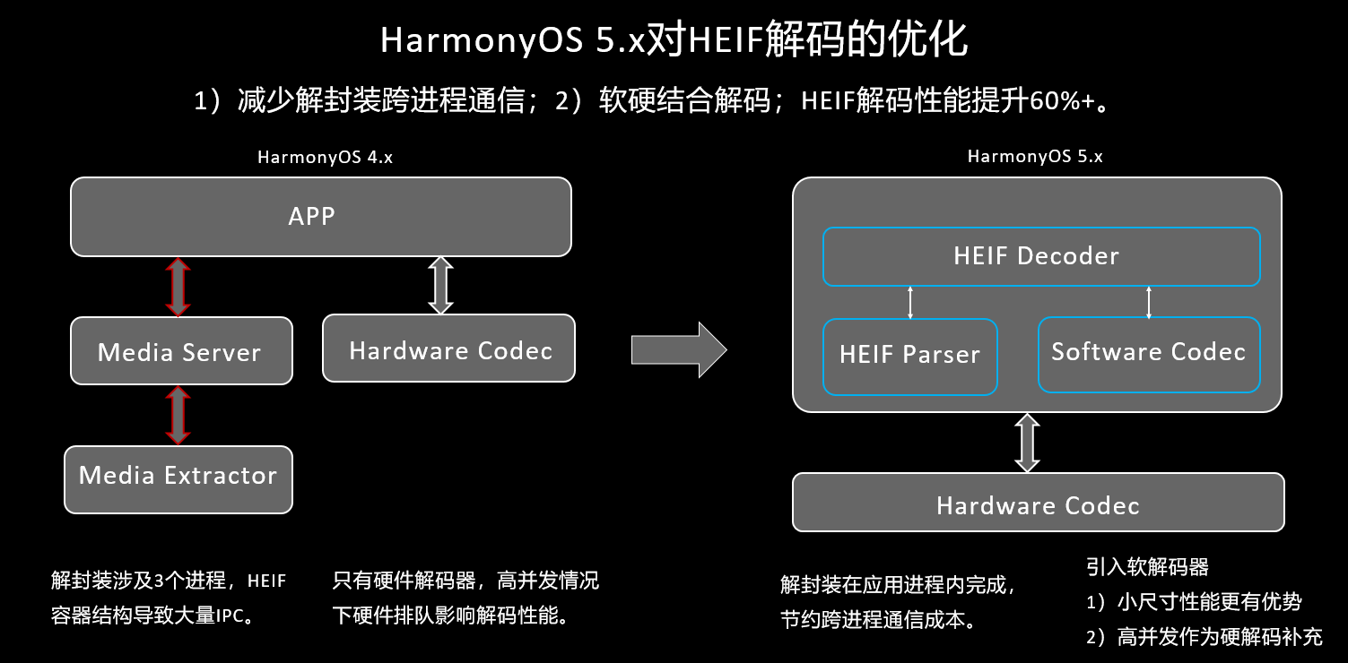 自HarmonyOS 5.0起,对HEIF图像的支持已实现全面升级。系统底层架构进行了优化,结合软硬协同的解码方案,大幅提升了解码效率与运行性能。HarmonyOS 5.x相比于HarmonyOS 4.x,HEIF解码性能提升60%以上,为用户带来更快速、更流畅、更高质量的图像体验。同时,系统也支持HEIF硬件编码,能够快速得到HEIF图片。