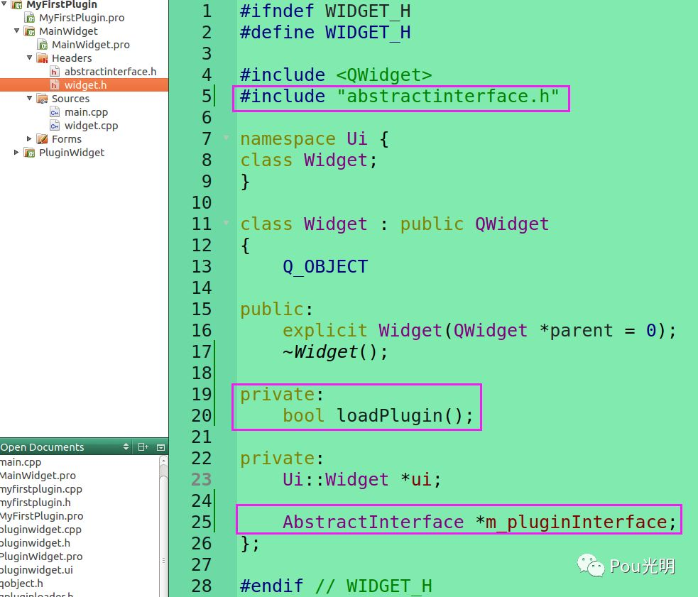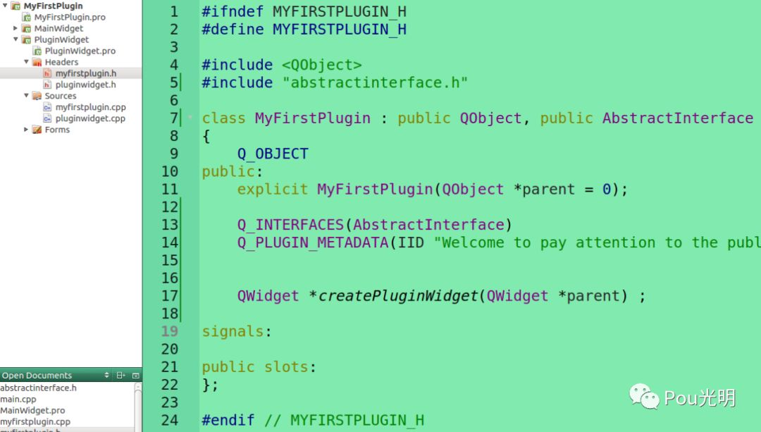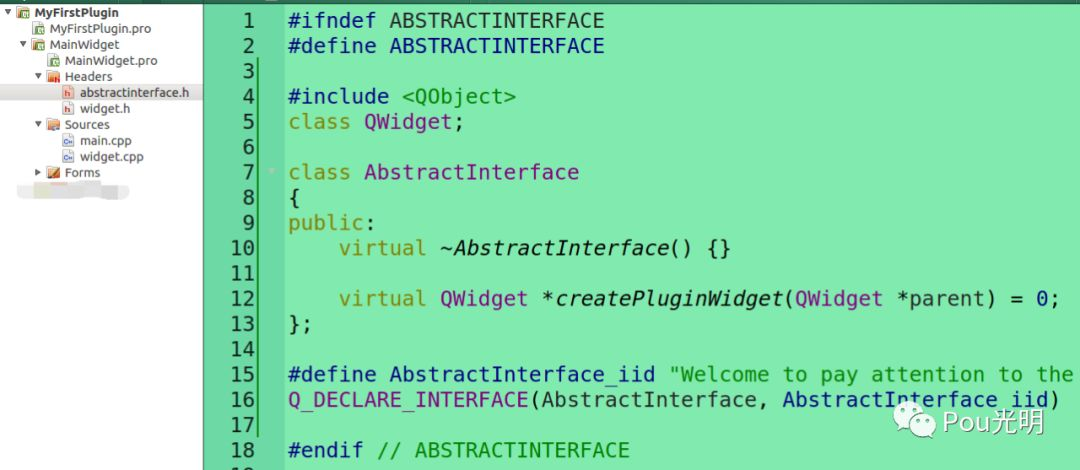 这步还没结束,还要再继承AbstractInterface类,但是在myfirstplugin.h中无法直接包含abstractinterface.h,这时需要修改PluginWidget.pro。根据创建的目录添加INCLUDEPATH += ../MainWidget,这时就可以include abstractinterface.h了。